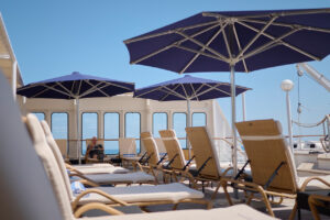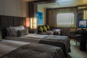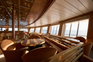 - Onboard library, gym, pool, hot tub, sauna, steam room, observation lounge, café, bar and retail stores