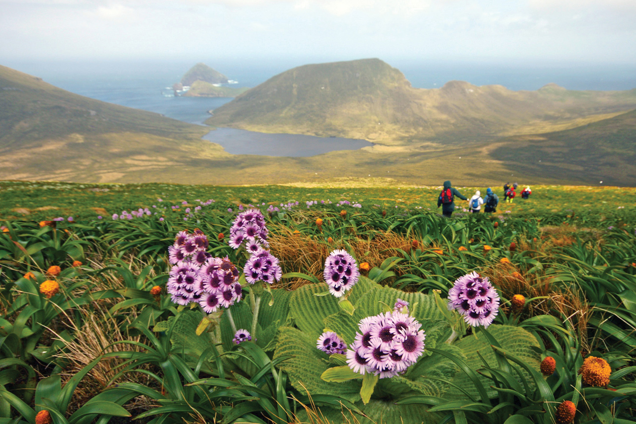 We have a full day to explore Campbell Island, New Zealand’s southernmost Subantarctic territory. Its history is as rich and varied as the other islands we visit. Discovered in 1810, it was soon occupied by sealers who introduced rats and cats. Farming followed from 1895 to 1934 when it was abandoned. Coastwatchers were stationed on the island during the war and at the end of the war the station was taken over by the New Zealand Metrological service. They maintained a manned weather/ research station there until 1995. In the early 1970s the removal of farm animals commenced and all were eventually removed by 1990. The vegetation recovered quickly and the cats died out naturally. In a very ambitious (and never before attempted on such a large scale) eradication programme the New Zealand Department of Conservation successfully removed the rats. With the island declared predator free, the way was clear to reintroduce the endangered Campbell Island Flightless Teal, which had been rediscovered on an offshore island in 1975. Snipe, which were formerly unknown from the island but were discovered on another offshore island, recolonised the islands themselves. The vegetation which the great English botanist Sir Joseph Hooker described in 1841 as having a “Flora display second to none outside the tropics” is flourishing and is nothing short of spectacular. We will offer a number of options which will enable you to explore the island including an extended walk to Northwest Bay. There will also be an easier walk to the Col Lyall Saddle. All of these options will allow you the opportunity and time to enjoy the Southern Royal Albatross which nest here in large numbers. We also visit areas of the island which contain outstanding examples of the megaherbs for which the island is renowned.