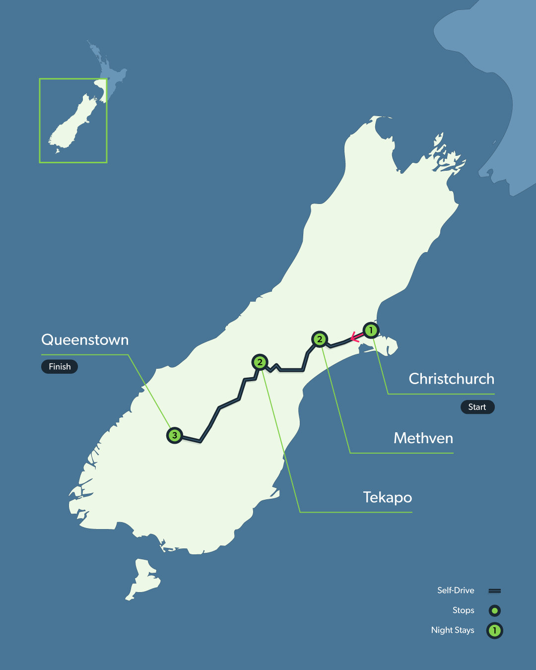 | Starts | Christchurch, South Island |